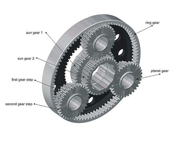 行星传动系统(或众所周知的行星系统)通常由一个中心枢转的太阳齿轮、一个齿圈和几个在它们之间旋转的行星齿轮组成。这个组装概念解释了行星传动这个术语,因为行星齿轮围绕太阳齿轮旋转,就像在天文学上行星围绕太阳旋转一样。