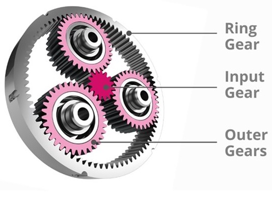 行星式齿轮减速于传动时,太阳齿、行星齿、内环齿间共有六个接触面均匀承受负载,并依附着内环齿迹呈360度均匀分布承受冲击负荷,可降低齿轮之间摩擦,减小了齿轮断裂的隐患。行星采用浮游式运动,其间隙相当紧密,每级减速齿轮间只需籍几阶段齿轮啮合,故其体积相对减小且最高效率可达97%。